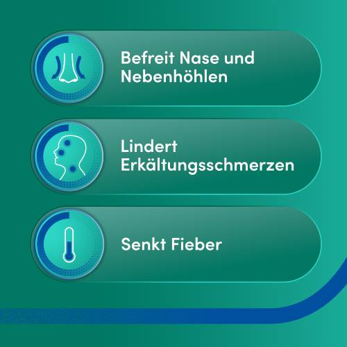 • 3-fach effektiv bei Erkältungen mit Schnupfen, Schmerzen und Fieber: wirkt abschwellend in Nase und Nebenhöhlen, bekämpft Erkältungsschmerzen (wie Kopf-, Hals- und Gliederschmerzen) und senkt das Fieber