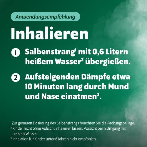 Zur Inhalation einen 3-5cm langen Salbenstrang (bei Kindern und besonders sensiblen Patienten 2-3cm) mit 0,6 Liter heißem Wasser übergießen. Die aufsteigenden Dämpfe werden durch Nase oder Mund (zur Behandlung der Bronchien) etwa 10 Minunten eingeatmet. Vorsicht, anfangs sind die Dämpfe heiß und können zu Verbrühungen führen!