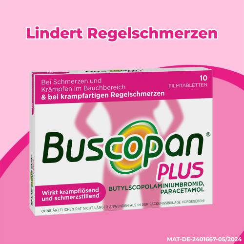 Buscopan® plus Filmtabletten. Wirkstoffe: Butylscopolaminiumbromid, Paracetamol. Anwendungsgebiet: Bei krampfartigen Schmerzen bei Erkrankungen des Magens und des Darmes, krampfartigen Schmerzen und Funktionsstörungen im Bereich der Gallenwege, der ableitenden Harnwege sowie der weiblichen Geschlechtsorgane (z. B. schmerzhafte Regelblutungen). Warnhinweis: Ohne ärztlichen Rat nicht länger anwenden als in der Packungsbeilage vorgegeben! Apothekenpflichtig.