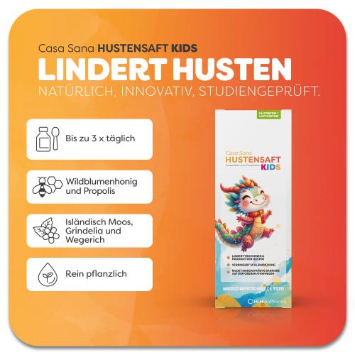 Casa Sana HUSTENSAFT KIDS – Pflanzliches Medizinprodukt zur Behandlung von trockenem und produktivem Husten. Mit Wildblumenhonig, Grindelia-Blüten, Wegerich, Isländisch Moos, Propolis und Kiefernnadel-Öl. Ab 3 Jahren