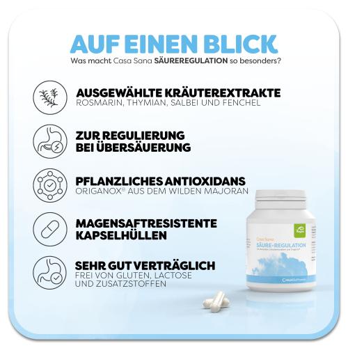 Casa Sana SÄURE-REGULATION ist ein hochwertiger Pflanzen- & Mineralstoffkomplex in Apothekenqualität. Das Präparat fördert die natürliche Regulation und Unterstützung des Säure-Basen-Haushaltes bei Übersäuerung und einem niedrigen pH-Wert. Casa Sana SÄURE-REGULATION enthält die traditionell bewährten Pflanzenstoffe Rosmarin, Fenchel, Salbei, Thymian und einen wertvollen Extrakt aus wildem Majoran – das besonders hoch dosierte Antioxidans ORIGANOX® ergänzt durch die Mineralstoffe Kaliumhydrogencarbonat, Natriumbicarbonat, Magnesium und Calcium (als Citrate).