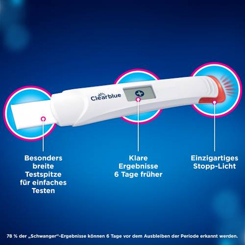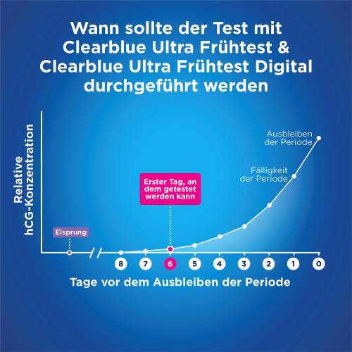 1Clearblue Ultra Frühtest: 79 % der Ergebnisse „Schwanger“ können 6 Tage vor dem Ausbleiben der Periode erkannt werden (dies entspricht 5 Tage vor Fälligkeit der Periode). Clearblue Schwangerschaftstest Ultra Frühtest Digital: 78% der Ergebnisse „Schwanger“ können 6 Tage vor dem Ausbleiben der Periode erkannt werden (dies entspricht 5 Tage vor Fälligkeit der Periode).