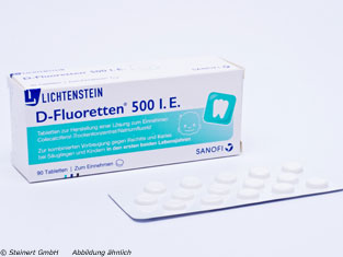 | Berücksichtigen Sie bitte die zusätzliche Fluoridzufuhr aus Lebensmitteln, Getränken und Arzneimitteln bei der Dosierung. Informieren Sie sich hierzu bei Ihrem Arzt oder Apotheker. | |||