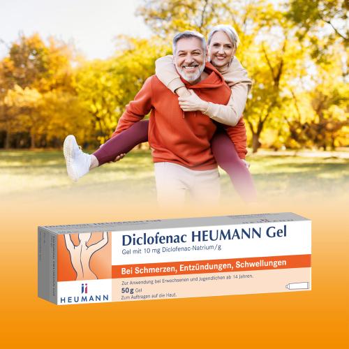 Pflichtangaben: Diclofenac HEUMANN Gel, Gel mit 10 mg Diclofenac-Natrium/g (Wirkstoff: Diclofenac-Natrium). Zur Anwendung bei Erwachsenen und Jugendlichen ab 14 Jahren. Anw.: Bei Erwachsenen zur äußerlichen Behandlung von Schmerzen, Entzündungen und Schwellungen bei: Sport- und Unfallverletzungen (Verstauchungen, Prellungen, Zerrungen); rheumatischen Erkrankungen der Weichteile (Sehnen- und Sehnenscheidenentzündungen, Schleimbeutelentzündungen, Entzündungen im Muskel- und Kapselbereich); degenerativen Erkrankungen der oberen und unteren Gliedmaßen (periphere Extremitätengelenke). Bei Jugendlichen über 14 Jahre zur Kurzzeitbehandlung, zur lokalen, symptomatischen Behandlung von Schmerzen bei akuten Prellungen, Zerrungen oder Verstauchungen infolge eines stumpfen Traumas. Stand: 11/2023.