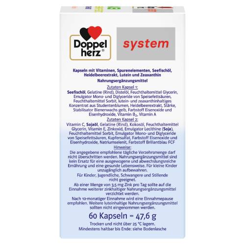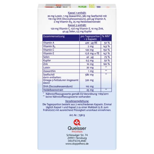 Kapsel 1 trägt mit Vitamin A zum Erhalt der normalen Sehkraft bei. Zusätzlich ist die Omega-3-Fettsäure DHA in Kombination mit Lutein, Zeaxanthin und Heidelbeerextrakt enthalten. Das fettlösliche Vitamin A und das wasserlösliche Vitamin B2 leisten einen Beitrag zum Erhalt der normalen Sehkraft. Vitamin B2 trägt zum Erhalt der normalen Schleimhäute bei. Lutein und Zeaxanthin kommen vor allem in pflanzlichen Lebensmitteln (z. B. grünem Gemüse) vor. Der so genannte „Gelbe Fleck“ der Netzhaut enthält eine hohe Konzentration an Lutein und Zeaxanthin. Der „Gelbe Fleck“ liegt in der Mitte des Augenhintergrundes. Heidelbeeren sind eine beliebte Beerensorte in der menschlichen Ernährung. Sie wurden bereits vor Jahrhunderten in den Wäldern und Mooren Europas gesammelt und wegen ihrer Inhaltsstoffe geschätzt. Die Omega-3-Fettsäure DHA (Docosahexaensäure) kommt in den Sehzellen der Netzhaut vor. Die Kapseln von Doppelherz system enthalten eine besonders hohe Konzentration an Omega-3-Fettsäuren. Das Omega-3-Konzentrat erreicht einen Omega-3-Fettsäuren-Anteil von 55 %. In herkömmlichen Fischölprodukten sind nur etwa 30 % enthalten. Dabei sind es gerade die Omega-3-Fettsäuren, die die Fischöle so wertvoll machen.