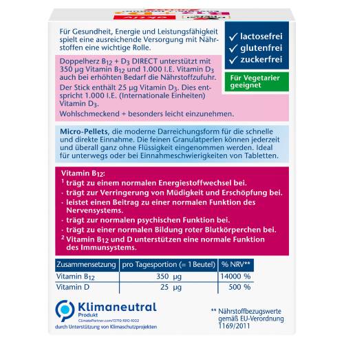Für Gesundheit, Energie und Leistungsfähigkeit spielt eine ausreichende Versorgung mit Nährstoffen eine wichtige Rolle. Doppelherz B12 + D3 DIRECT unterstützt mit 350 μg Vitamin B12 und 1.000 I.E. Vitamin D3 auch bei erhöhten Bedarf die Nährstoffzufuhr. Der Stick enthält 25 μg Vitamin D3. Dies entspricht 1.000 I.E. (Internationale Einheiten) Vitamin D3. Die Micro-Pellets sind wohlschmeckend und besonders leicht einzunehmen. Die feinen Granulatperlen können jederzeit und überall ganz ohne Flüssigkeit eingenommen werden. Damit ist die moderne Darreichungsform ideal für unterwegs oder bei Einnahmeschwierigkeiten von Tabletten. Vitamin B12 trägt zu einem normalen Energiestoffwechsel und zur Verringerung von Müdigkeit und Erschöpfung bei. Zudem leistet Vitamin B12 einen Beitrag zu einer normalen Funktion des Nervensystems und trägt zur normalen psychischen Funktion bei. Vitamin B12 und D unterstützen eine normale Funktion des Immunsystems.