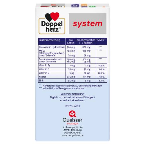 Unser Bewegungsapparat (Knorpel, Knochen, Bindegewebe) wird jeden Tag gefordert. Einseitige Beanspruchung, Übergewicht und zunehmendes Alter sind belastende Faktoren. Für den Erhalt der Mobilität und Lebensqualität in jedem Alter kann ausreichende, schonende Bewegung sowie eine gesunde Ernährung einen Beitrag leisten. Doppelherz system GLUCOSAMIN PLUS 800 enthält eine spezielle Kombination der lebenswichtigen Mikronährstoffe Kupfer, Zink, Selen und Vitamin C. Zusätzlich sind 800 mg Glucosaminsulfat und 50 mg Chondroitinsulfat enthalten. Vitamin C unterstützt die normale Kollagenbildung für eine normale Funktion von Knochen und Knorpel. Kupfer leistet einen Beitrag zur Aufrechterhaltung des Bindegewebes. Das Bindegewebe bildet die Stütz- und Stabilisierungsstrukturen des Körpers. Vitamin C und die Spurenelemente Zink, Selen und Kupfer leisten einen Beitrag zum Schutz der Zellen vor oxidativem Stress. Zink trägt zum Erhalt der normalen Knochen bei. Glucosamin und Chondroitin sind Stoffe tierischen Ursprungs. Glucosamin ist eine spezielle Eiweißstruktur, ein so genannter Aminozucker. Chondroitin gehört zur Gruppe der Glucosaminglycane. Glucosamin ist ein Strukturbestandteil des Panzers der Garnelen. Vitamine und Spurenelemente kann der Körper nicht selbst bilden. Sie sind essentiell und müssen täglich mit der Nahrung aufgenommen werden. Bei unausgewogener Ernährung oder erhöhtem Bedarf kann es zu Versorgungslücken kommen. Vitamine und Mineralstoffe liegen im Körper nur in kleinen Mengen vor, daher nennt man sie auch Mikronährstoffe. Kleine Mengen – große Wirkung: Eine gute Versorgung mit Vitaminen und Mineralstoffen ist eine wichtige Voraussetzung für den normalen Ablauf des Stoffwechsels und einer gesunden Organfunktion. Die Kapseln von Doppelherz system enthalten eine Kombination lebenswichtiger