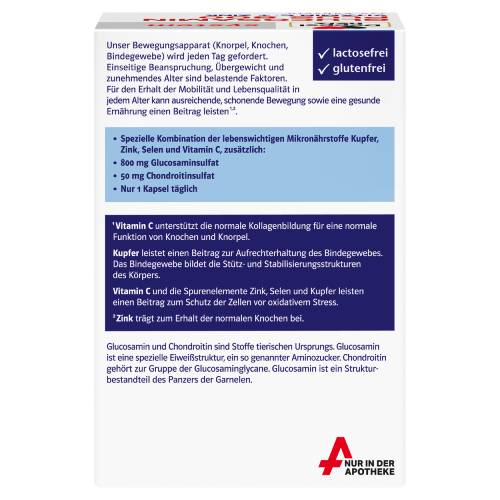 Unser Bewegungsapparat (Knorpel, Knochen, Bindegewebe) wird jeden Tag gefordert. Einseitige Beanspruchung, Übergewicht und zunehmendes Alter sind belastende Faktoren. Für den Erhalt der Mobilität und Lebensqualität in jedem Alter kann ausreichende, schonende Bewegung sowie eine gesunde Ernährung einen Beitrag leisten. Doppelherz system GLUCOSAMIN PLUS 800 enthält eine spezielle Kombination der lebenswichtigen Mikronährstoffe Kupfer, Zink, Selen und Vitamin C. Zusätzlich sind 800 mg Glucosaminsulfat und 50 mg Chondroitinsulfat enthalten. Vitamin C unterstützt die normale Kollagenbildung für eine normale Funktion von Knochen und Knorpel. Kupfer leistet einen Beitrag zur Aufrechterhaltung des Bindegewebes. Das Bindegewebe bildet die Stütz- und Stabilisierungsstrukturen des Körpers. Vitamin C und die Spurenelemente Zink, Selen und Kupfer leisten einen Beitrag zum Schutz der Zellen vor oxidativem Stress. Zink trägt zum Erhalt der normalen Knochen bei. Glucosamin und Chondroitin sind Stoffe tierischen Ursprungs. Glucosamin ist eine spezielle Eiweißstruktur, ein so genannter Aminozucker. Chondroitin gehört zur Gruppe der Glucosaminglycane. Glucosamin ist ein Strukturbestandteil des Panzers der Garnelen. Vitamine und Spurenelemente kann der Körper nicht selbst bilden. Sie sind essentiell und müssen täglich mit der Nahrung aufgenommen werden. Bei unausgewogener Ernährung oder erhöhtem Bedarf kann es zu Versorgungslücken kommen. Vitamine und Mineralstoffe liegen im Körper nur in kleinen Mengen vor, daher nennt man sie auch Mikronährstoffe. Kleine Mengen – große Wirkung: Eine gute Versorgung mit Vitaminen und Mineralstoffen ist eine wichtige Voraussetzung für den normalen Ablauf des Stoffwechsels und einer gesunden Organfunktion. Die Kapseln von Doppelherz system enthalten eine Kombination lebenswichtiger