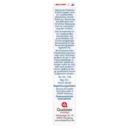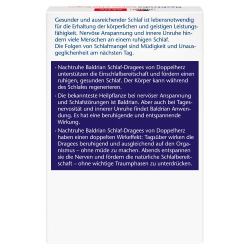 Nachtruhe Baldrian Schlaf-Dragees sind ein traditionelles pflanzliches Arzneimittel zur Besserung des Befindens bei nervlicher Belastung und zur Unterstützung des Schlafes. Das Arzneimittel ist ein traditionelles Arzneimittel, das ausschließlich auf Grund langjähriger Anwendung für das Anwendungsgebiet registriert ist.