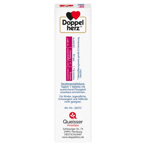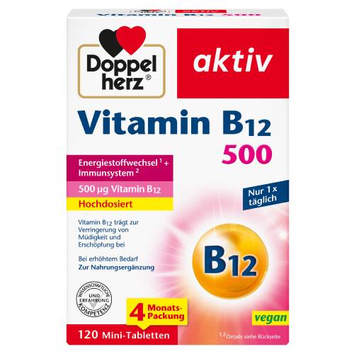 Eine Tablette Doppelherz Vitamin B12 enthält 500 μg Vitamin B12 und unterstützt daher auch bei einem erhöhten Bedarf sowie bei einer unausgewogenen Ernährung die gute Vitamin B12-Versorgung. Für Gesundheit, Energie und Leistungsfähigkeit spielt eine ausreichende Versorgung mit Nährstoffen eine wichtige Rolle. Hierzu gehört auch das Vitamin B12. Eine sehr gute Vitamin B12-Quelle stellen tierische Lebensmittel dar. Lebensmittel pflanzlicher Herkunft enthalten normalerweise nur geringe Mengen an Vitamin B12. Vitamin B12 trägt zu einem normalen Energiestoffwechsel, zur Verringerung von Müdigkeit und Erschöpfung sowie zur normalen psychischen Funktion bei. Darüber hinaus leistet Vitamin B12 einen Beitrag zu einer normalen Funktion des Nervensystems und zu einer normalen Bildung der roten Blutkörperchen. Vitamin B12 unterstützt zudem eine normale Funktion des Immunsystems.