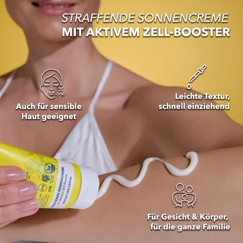 Entdecken Sie die straffende Sonnencreme mit Zell-Booster, die Hautpflege und Sonnenschutz intelligent vereint – ideal für Gesicht und Körper. Die vegane Formulierung schützt mit LSF 50 sowie UVA- und UVB-Filter vor Sonneneinstrahlung und Blue Light, während 4 % Niacinamide die Hautstruktur unterstützen und Feuchtigkeit spenden.