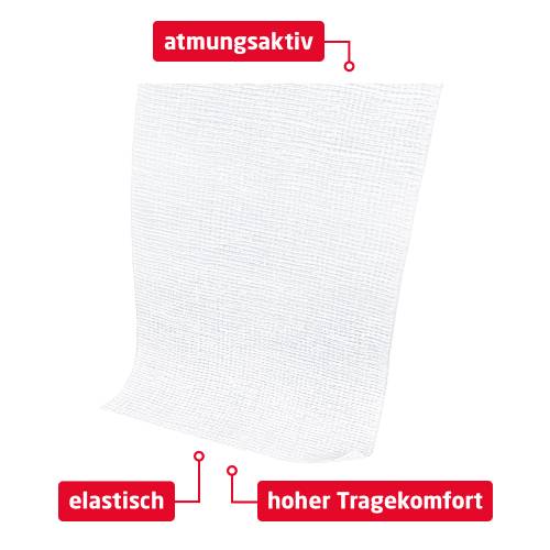 • Die Binde bleibt auch an viel bewegten Körperteilen haften und fixiert die Kompresse/Wundauflage.