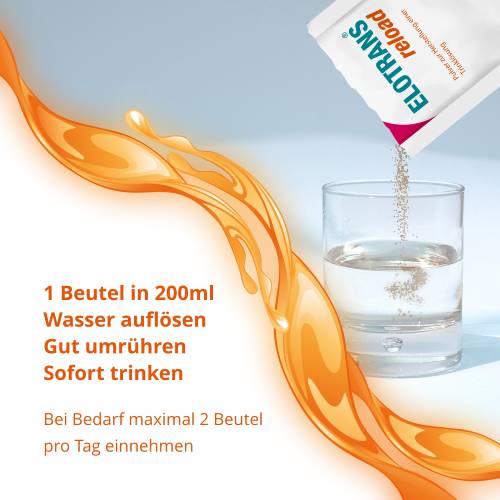 Nach Bedarf (zum Beispiel nach dem Sport oder durchtanzten Nächten) den Inhalt eines Beutels in 200 ml Trinkwasser geben und gut umrühren, bis sich das Pulver vollständig aufgelöst hat. Die zubereitete Lösung anschließend sofort trinken, schmeckt fruchtig frisch nach Orange. Die Höchstmenge von 2 Beuteln pro Tag sollte nicht überschritten werden. HÄUFIGE FRAGEN & ANTWORTEN Wie ist die Zusammensetzung von Elotrans® reload? Traubenzucker (Glucose), Fructooligosaccharide, Magnesiumlactat, Natriumcitrat, Natriumchlorid, Cholinbitartrat, Kaliumchlorid, Orangenaroma, Säuerungsmittel Äpfelsäure, Süßungsmittel Sucralose, Rote Bete-Saftpulver, Pantothensäure (als Calcium-D-pantothenat), Vitamin B2 (als Riboflavin). Welche Vorteile bringen Vitamin B2, Vitamin B5 und Cholin? Pantothensäure (Vitamin B5) und Riboflavin (Vitamin B2) vitalisieren den Körper, indem sie zur Verringerung von Müdigkeit und Ermüdung und zu einem normalen Energiestoffwechsel beitragen. Zusätzlich dazu trägt Pantothensäure zu einer normalen geistigen Leistung bei, Riboflavin trägt zum Erhalt einer normalen Haut bei und dazu, die Zellen vor oxidativem Stress zu schützen. Cholin trägt zur Erhaltung einer normalen Leberfunktion bei.