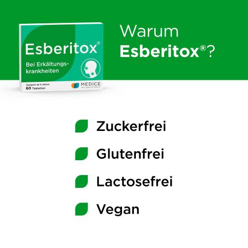 Bei ersten Schluckbeschwerden, erstem Halsweh, beginnender Schnupfnase oder Druck auf den Bronchien eingenommen wirkt Esberitox am effektivsten. Gemeinsam bekämpfen Färberhülse, Sonnenhut und Lebensbaum die Erkältung aus verschiedenen Richtungen; unter anderem werden die Viren direkt bekämpft, das Immunsystem gestärkt und gleichzeitig werden Keim vernichtende Fresszellen aktiviert.