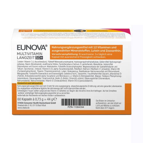 EUNOVA® Langzeit 50+ ist speziell auf den Nährstoffbedarf von Menschen ab 50 Jahren abgestimmt und enthält 12 Vitamine, wertvolle Mineralstoffe, Lutein und Zeaxanthin, die zu den Carotinoiden gehören, in einem ausgewogenen Verhältnis. EUNOVA® Langzeit 50+ verfügt neben der Nährstoffperlen-Technologie auch über ein Plus an pflanzlichen Antioxidantien. Die einzigartige Langzeit-Technologie verbessert die Aufnahme von Nährstoffen durch eine spezielle Kombination von schnell und langsam freigesetzten Perlen. Fast alle wasserlöslichen Vitamine werden über mehrere Stunden nach und nach freigesetzt. Lediglich bei Vitamin B12 und Folsäure wurde bewusst auf eine zeitverzögerte Freisetzung verzichtet, um eine optimale Aufnahme zu gewährleisten.