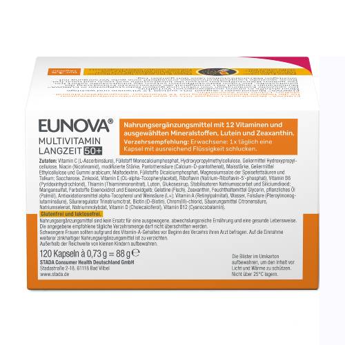 EUNOVA® Langzeit 50+ ist speziell auf den Nährstoffbedarf von Menschen ab 50 Jahren abgestimmt und enthält 12 Vitamine, wertvolle Mineralstoffe, Lutein und Zeaxanthin, die zu den Carotinoiden gehören, in einem ausgewogenen Verhältnis. EUNOVA® Langzeit 50+ verfügt neben der Nährstoffperlen-Technologie auch über ein Plus an pflanzlichen Antioxidantien. Die einzigartige Langzeit-Technologie verbessert die Aufnahme von Nährstoffen durch eine spezielle Kombination von schnell und langsam freigesetzten Perlen. Fast alle wasserlöslichen Vitamine werden über mehrere Stunden nach und nach freigesetzt. Lediglich bei Vitamin B12 und Folsäure wurde bewusst auf eine zeitverzögerte Freisetzung verzichtet, um eine optimale Aufnahme zu gewährleisten.