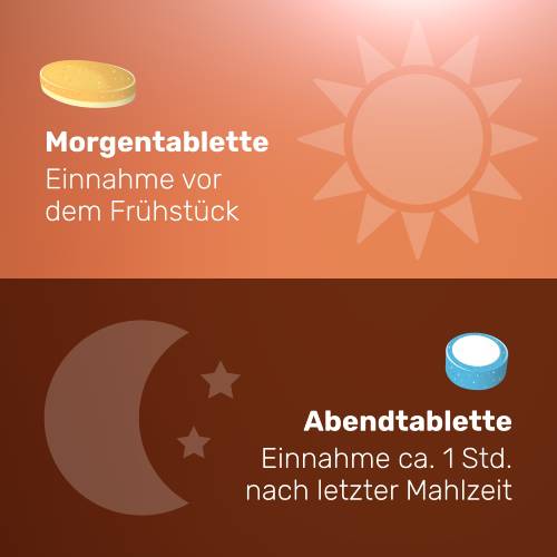 Eine gelb-weiße Morgen-Tablette vor dem Frühstück. Eine blau-weiße Abend-Tablette frühestens eine Stunde nach der letzten Mahlzeit