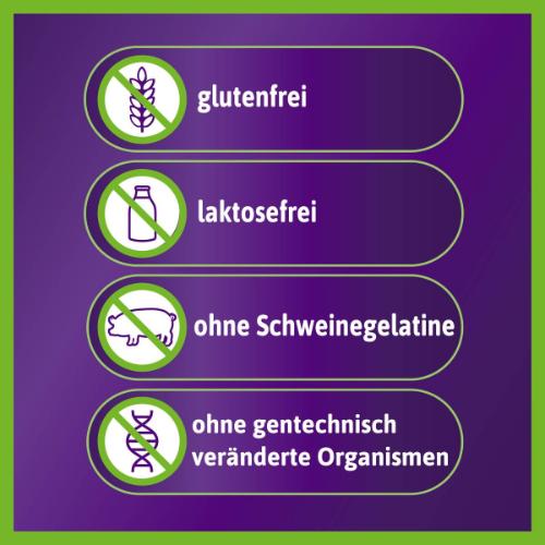 • FREI VON: ohne gentechnisch veränderte Organismen, Glutenfrei, Laktosefrei, Ohne Schweinegelatine