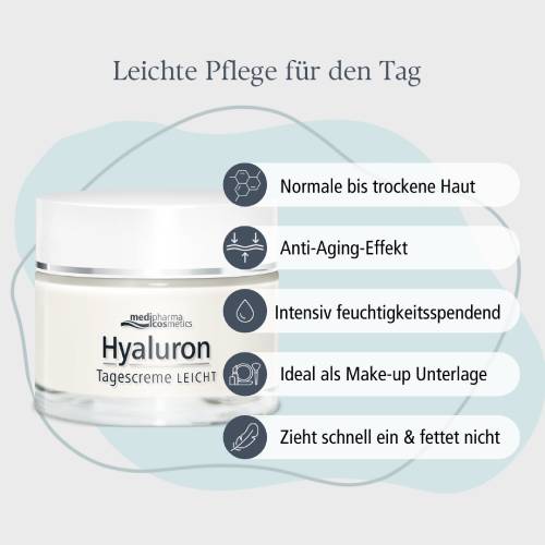 Die Hyaluron Tagespflege LEICHT von medipharma cosmetics ist eine wirksame Gesichtspflege, die speziell für die tägliche Anwendung bei normaler bis trockener Haut entwickelt wurde.