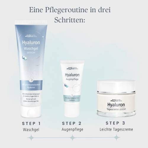Für eine umfassende Pflegeroutine kann die Tagespflege mit der Hyaluron Augenpflege von medipharma cosmetics ergänzt werden, die sowohl morgens als auch abends angewendet werden kann. Die Hyaluron Tagespflege LEICHT vereint die effektive Feuchtigkeitsversorgung mit einer Anti-Aging-Wirkung in einem Produkt und bietet somit eine ausgewogene Pflege für die normale bis trockene Haut.