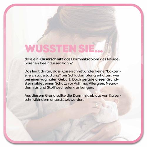 Die Geburt eines Kindes ist ein entscheidender Moment, nicht nur für das Leben der Eltern, sondern auch für die Gesundheit des Babys. Während einer natürlichen Geburt wird das Neugeborene durch den Geburtskanal mit wichtigen Mikroorganismen der mütterlichen Darm- und Vaginalflora besiedelt. Diese ersten Keime sind essenziell für die Entwicklung des kindlichen Immunsystems und der Darmflora, die wiederum langfristig die Gesundheit des Kindes beeinflussen. Bei einer Kaiserschnittgeburt wird dieser natürliche Prozess umgangen, wodurch die Erstbesiedelung des kindlichen Darms vor allem durch Haut- und Umweltbakterien erfolgt. Studien zeigen, dass dies mit einer verzögerten Reifung des Immunsystems und einem erhöhten Risiko für Allergien, Asthma oder Stoffwechselerkrankungen einhergehen kann.