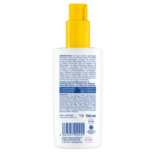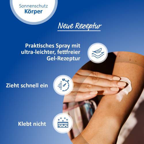 Tragen Sie das Sonnenschutz-Spray vor dem Sonnen großzügig auf und cremen Ihren ganzen Körper damit ein. Besonders gut eincremen: Nasen, Lippen, Ohren, Schultern, Dekolleté, Fußrücken und unbehaarte Kopfhaut. Um den Schutz aufrechtzuerhalten, alle zwei Stunden sowie nach dem Baden und Schwitzen nachcremen. Zu wenig Sonnenschutzmittel verringert den Lichtschutzfaktor.