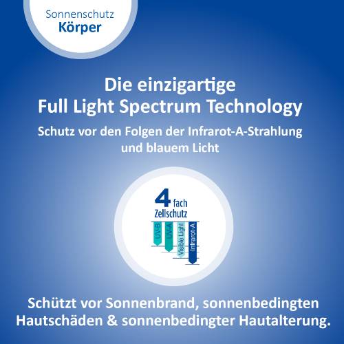 Sonnenstrahlen gibt es in verschiedenen Wellenlängen. Sie haben verschiedene Auswirkungen auf die Haut, wirken jedoch alle zellschädigend. Daher ist es wichtig einen Sonnenschutz zu verwenden, der rundum schützt. Dank einzigartigem 4-fach Zellschutz schützt das Ladival® Allergische Haut Sonnenschutz-Spray vor UV-A- und UV-B-Strahlen, vor den Folgen der Infrarot-A-Strahlung und sichtbarem Licht (einschließlich blauem Licht). So wird die Haut auch vor einer vorzeitigen, sonnenbedingten Hautalterung geschützt.