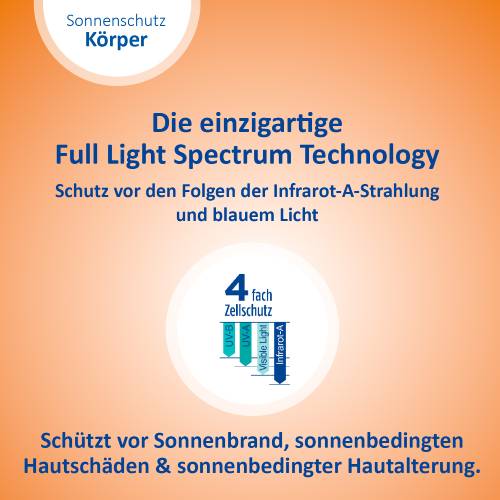 Sonnenstrahlen gibt es in verschiedenen Wellenlängen. Sie haben verschiedene Auswirkungen auf die Haut, wirken jedoch alle zellschädigend. Daher ist es wichtig einen Sonnenschutz zu verwenden, der rundum schützt. Dank einzigartigem 4-fach Zellschutz schützt die Ladival® Empfindliche & Normale Haut Sonnenschutz-Lotion vor UV-A- und UV-B-Strahlen, vor den Folgen der Infrarot-A-Strahlung und sichtbarem Licht (einschließlich blauem Licht). So wird die Haut auch vor einer vorzeitigen, sonnenbedingten Hautalterung geschützt.