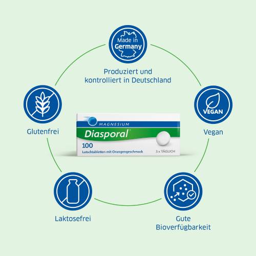 Die Magnesium Diasporal 100 Lutschtabletten werden zum Ausgleich und zur Prophylaxe eines Magnesiummangels angewendet. Die Lutschtabletten enthalten den Mineralstoff Magnesiumcitrat in einer Dosierung von 100 mg pro Lutschtablette. Magnesiumcitrat verfügt über eine hohe Bioverfügbarkeit, wodurch es besonders schnell von Körper aufgenommen wird. Die Magnesiumkonzentration im Blut steigt schnell an, so dass mehr Magnesium in die Muskeln gelangt. Die Magnesium Diasporal 100 Lutschtabletten können Beschwerden, wie zum Beispiel Muskelkrämpfe, Verspannungen und Migräne spürbar lindern.