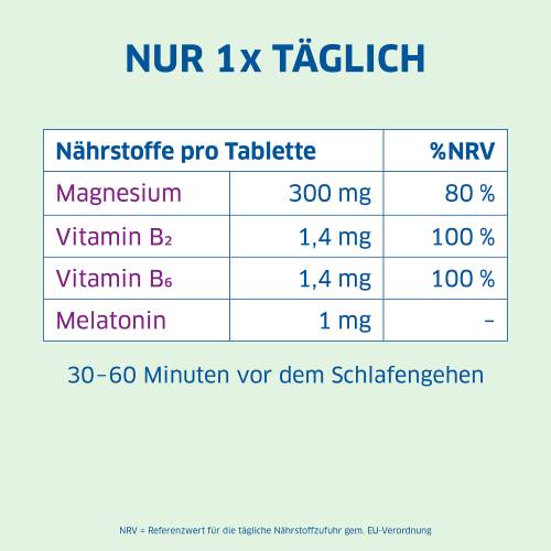 Nahrungsergänzungsmittel mit 300 mg Magnesium, 1 mg Melatonin plus Vitamine B2 und B6. Mit Süßungsmittel Xylit.