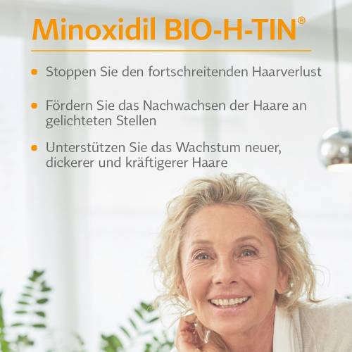Um das Fortschreiten des erblich bedingten Haarausfalls aufzuhalten, empfehlen wir bei erwachsenen Frauen eine 2x tägliche Anwendung von Minoxidil BIO-H-TIN 20 mg/ml auf der Kopfhaut. Voraussetzung für den Therapieerfolg ist eine dauerhafte Anwendung. Besonders gute Erfolge werden erzielt, wenn bereits frühzeitig mit der Therapie begonnen wird.