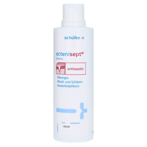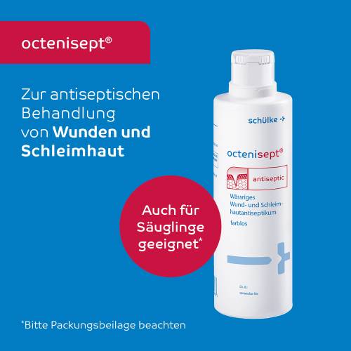 Die Octenisept Lösung wird zur Desinfektion und Reinigung von Wunden angewendet. Die Lösung enthält eine Kombination der beiden Wirkstoffe Octenidin + 2-Phenoxyethanol. Die Kombination dieser beiden Inhaltsstoffe verfügt über bakterizide, fungizide und viruzide Eigenschaften. Octenidin reagiert unter anderem mit Bestandteilen der äußeren Zellwände, wodurch es zu einer Zerstörung der Zellfunktion kommt. 2-Phenoxyethanol zerstört die Eiweiße der Erreger, so dass deren Stoffwechsel verhindert wird. Die Octenisept Lösung eignet sich zur Desinfektion vor Untersuchungen und zur antiseptischen Wundbehandlung.
