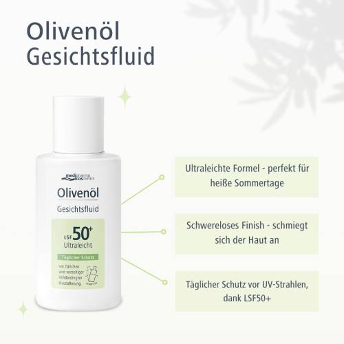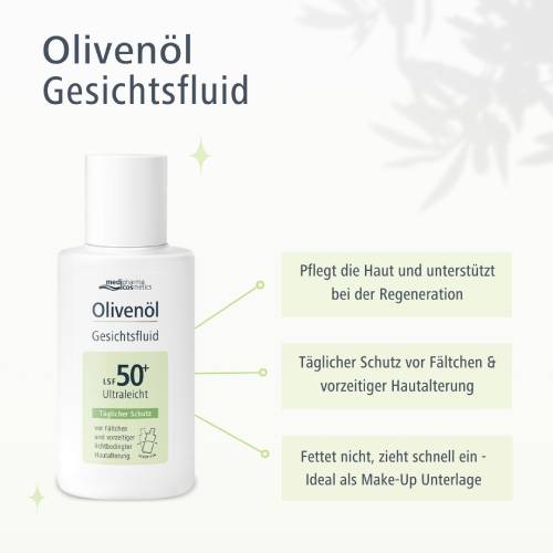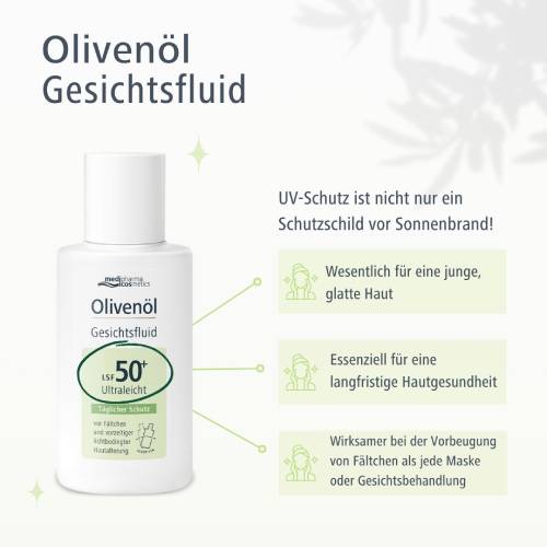 Verwöhnen Sie Ihre Haut mit der zuverlässigen Kombination aus UV-Schutz und wohltuender Pflege – vereint in dem Olivenöl Gesichtsfluid mit LSF50+ von medipharma cosmetics.