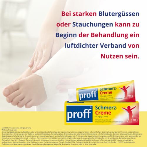 proff® Schmerzcreme – Seit 1983 in Deutschland zugelassen Schmerzen in Muskeln oder Gelenken können den Alltag stark einschränken. proff® Schmerzcreme wird äußerlich angewendet und wirkt lokal am betroffenen Bereich. Bereits seit 1983 in Deutschland zugelassen, zählt proff® Schmerzcreme zu den ersten topischen Arzneimitteln mit dem Wirkstoff Ibuprofen.