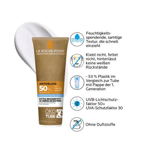 Feuchtigkeitsspendende Sonnenmilch für trockene und empfindliche Haut Die Anthelios Sonnenmilch LSF 50+ für den Körper schützt zuverlässig vor schädlichen UVA- und UVB-Strahlen. Dank Glycerin und Thermalwasser aus La Roche-Posay spendet sie bis zu 24 Stunden Feuchtigkeit. Anthelios Sonnenmilch LSF 50+ von La Roche Posay Dank Netlock-Technologie bildet die samtige Formel einen wasserfesten, sand- und schweißresistenten Schutz. Zudem verläuft, fettet sowie klebt der Sonnenschutz für empfindliche Haut nicht und hinterlässt keine weißen Rückstände. Die innovative Papp-Tube enthält FSC- oder PEFC-zertifizierte Pappanteile und spart, im Vergleich zur bisherigen Plastiktube, 45 % Neuplastik ein.