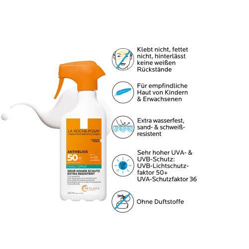 Wasserfestes Sonnenspray für empfindliche Haut für Kinder und Erwachsene Das Anthelios Invisible Family Spray LSF 50+ (ehem. Anthelios Dermo-Kids Invisible Spray LSF 50+, PZN: 16122171) schützt sensible und zu Sonnenallergie neigende Haut dank Breitbandschutz zuverlässig vor schädlicher UVA-, UVB- und Infrarot-A-Strahlung. Das wasserfeste Sonnenspray für den Körper gewährleistet dank Netlock-Technologie einen hohen und dennoch unsichtbaren Schutz für empfindliche Erwachsenen- und Kinderhaut. Es ist ohne Duftstoffe, nicht-klebend und hinterlässt keinen weißen Film auf der Haut. Die Sprühflasche im 300 ml Familien-Format kommt mit einem Trigger-Sprühkopf für die besonders einfache Anwendung.