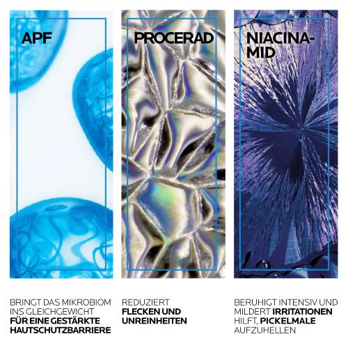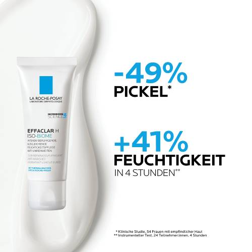 EFFACLAR H ISO-BIOME Feuchtigkeitspflege von La Roche Posay Bei einer austrocknenden Akne-Behandlung benötigt die Haut eine begleitende Pflege. Die EFFACLAR H ISO-BIOME Feuchtigkeitspflege wirkt ausgleichend und beruhigend. Gleichzeitig mildert sie Unreinheiten sowie gerötete und schuppige Hautpartien. Wirkungsvolle Inhaltsstoffe bei zu Akne neigender Haut Die Feuchtigkeitspflege von La Roche Posay enthält zum einen das Prebiotikum Orellana Extrakt, welches unreine Haut mildert und zugleich die Feuchtigkeit für bis zu 48h bewahrt. Zum anderen beinhaltet die Formel Procerad und Provitamin B5 sowie Aqua Posae Filiformis, wodurch das Mikrobiom und die geschwächte Hautbarriere gestärkt werden.