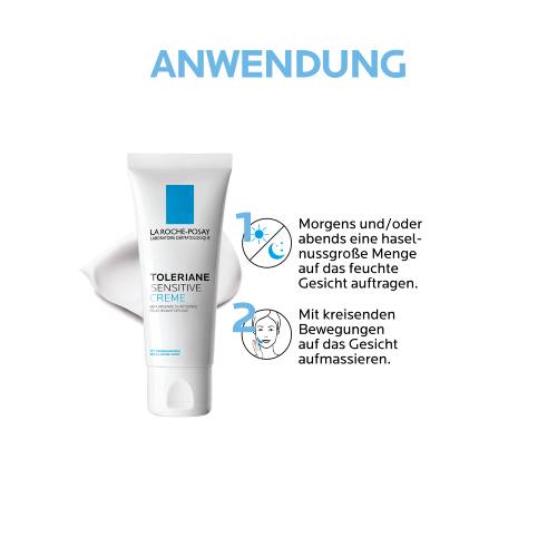 Die La Roche Posay TOLERIANE Sensitive Creme als Bestandteil der täglichen Hautpflege-Routine am Morgen und Abend auf die gereinigte Gesichtshaut auftragen und sanft einmassieren. Die Feuchtigkeitscreme auch auf Hals und Dekolleté auftragen. Da sie auf Duftstoffe und Alkohol verzichtet, ist sie sehr gut verträglich und auch zur Anwendung auf zarter Babyhaut oder bei zu Allergien neigender Haut geeignet. Besonders effektiv ist die La Roche Posay Gesichtscreme in Kombination mit dem TOLERIANE Reinigungsfluid sowie der TOLERIANE Dermallergo Augencreme.