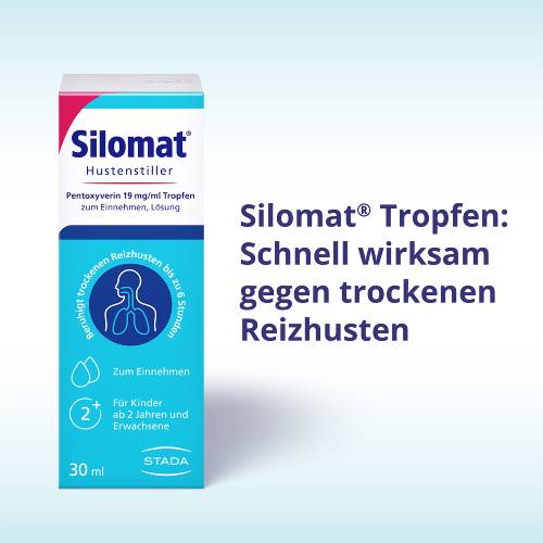 Silomat® Hustenstiller Pentoxyverin 19 mg/ml Tropfen zum Einnehmen, Lösung Zur Anwendung bei Erwachsenen und Kindern ab 2 Jahren Wirkstoff: Pentoxyverincitrat. Arzneimittel zur symptomatischen Behandlung des Reizhustens (Antitussivum). Hinweis: Enthält Propylenglycol. Zu Risiken und Nebenwirkungen lesen Sie die Packungsbeilage und fragen Sie Ihre Ärztin, Ihren Arzt oder in Ihrer Apotheke. STADA Consumer Health Deutschland GmbH, Stadastraße 2-18, 61118 Bad Vilbel Stand: Mai 2023