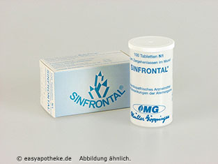 Sinfrontal Tabletten ist ein homöopathisches Arzneimittel zur Behandlung von Nasennebenhöhlenentzündungen, welche sich häufig durch dumpfe Kopfschmerzen, Abgeschlagenheit, Schnupfen mit erschwerter Nasenatmung sowie Druckgefühle im Stirn- oder Wangenbereich äußern. Die Anwendungsgebiete leiten sich von den homöopathischen Arzneimittelbildern ab. Die wirksamen homöopathischen Verdünnungen Zinnober, Eisenphosphat und Quecksilber regen auf besondere Weise die Selbstheilungskräfte an. Sinfrontal Tabletten wirken abschwellend auf die Schleimhäute und tragen zum Abbau der Sekretstauung in den Nebenhöhlen bei.