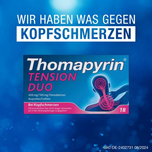 All dies macht Thomapyrin® TENSION DUO mit Ibuprofen und Coffein zu einer guten Wahl bei akuten Kopfschmerzen. 9 von 10 Verwendern sind mit der Wirkung so zufrieden, dass sie Thomapyrin® TENSION DUO erneut kaufen oder weiterempfehlen würden[1]. Überzeugen Sie sich selbst von der innovativen Wirkstoffkombination aus Ibuprofen und Coffein und bekämpfen Sie Kopfschmerzen in Verbindung mit Nacken- und Schulterbeschwerden dank Thomapyrin® TENSION DUO schneller1 und stärker. Thomapyrin®: Die Nr. 1 bei Kopfschmerzen und Migräne[2].