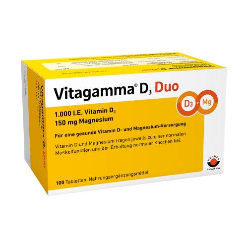 Pflichtangaben: Vitagamma® D3 Duo. Nahrungsergänzungsmittel. Zusammensetzung: 1.000 I.E. Vitamin D3 u. 150 mg Magnesium pro Tabl. Hinweis: Die angegebene empfohl. Verzehrmenge darf nicht überschritten werden. Nahrungsergänzungsmittel sollten nicht als Ersatz für eine ausgewogene Ernährung u. gesunde Lebensweise verwendet werden. Apothekenexklusiv. Wörwag Pharma GmbH & Co. KG, 71034 Böblingen