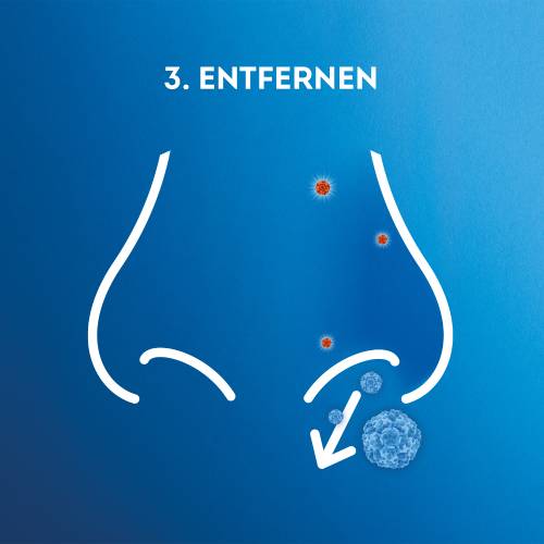 zwischen Zeige- und Mittelfinger halten. Ohne den Kopf nach hinten zu beugen, die Sprühöffnung in das Nasenloch halten und in Richtung des jeweiligen Ohres sprühen. Während des Sprühens nicht einatmen.